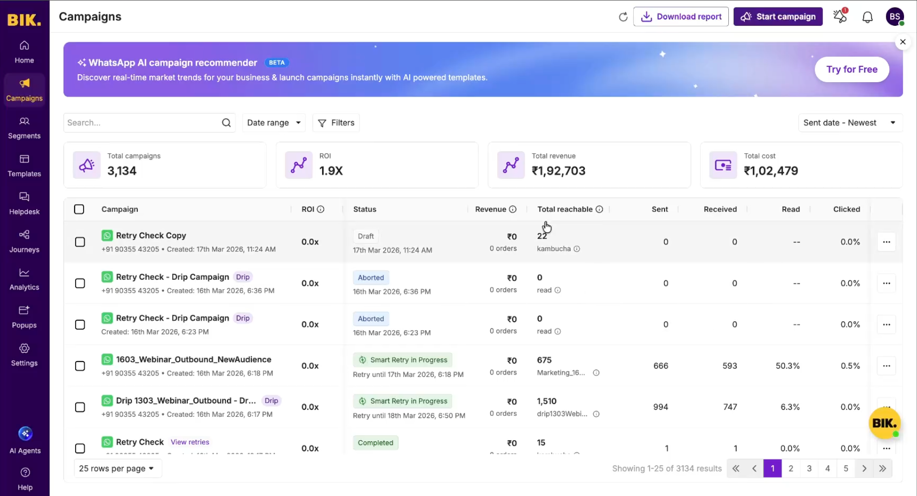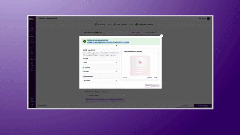 Instead of manually writing follow-up templates for every campaign segment, Drip AI does it for you. Feed it to your main campaign and it generates segment-aware WhatsApp drip templates, one for people who read but didn't click and one for those who clicked but didn't buy and one for those who abandoned. It preserves your original tone, variables, and buttons. You can schedule the drip before Meta even approves the template, so there's no waiting around.