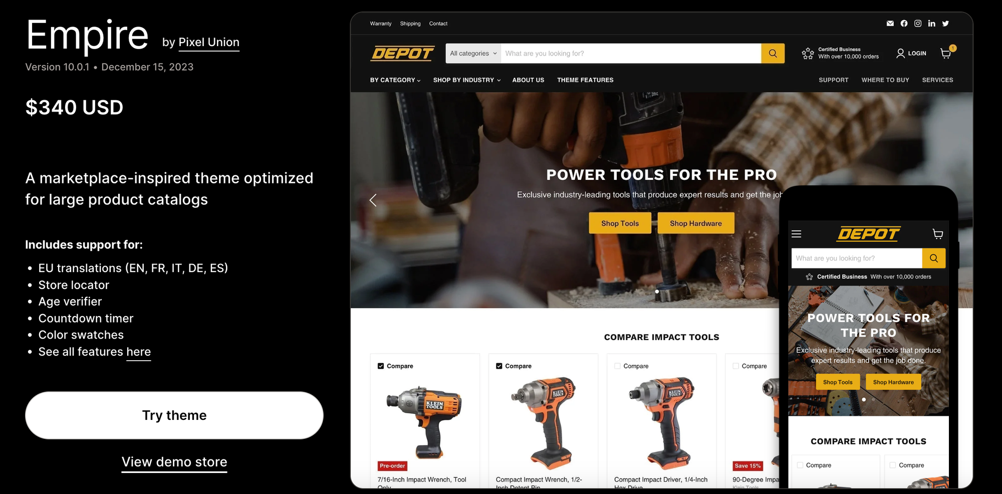 Empire Theme on Shopify is typically around $340, although it's essential to check the latest pricing on the Shopify Theme Store for the most accurate information. This one-time purchase cost includes all the features that the Empire theme shopify offers, like advanced filtering, responsive design, and large catalog management capabilities. The theme is designed for scalability, making it suitable for both growing and established businesses. Its price reflects its premium features and the value it can bring to an online store, especially those with extensive product ranges.