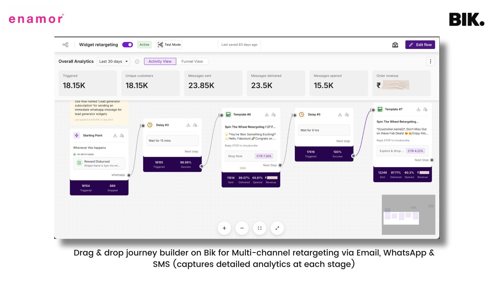 Enamor also used on-site event-based retargeting with BIK to boost conversions. By targeting customers who visited product pages, abandoned carts, or checkouts, Enamor sent contextualized WhatsApp reminders with personalized incentives to encourage them to complete their purchases.
