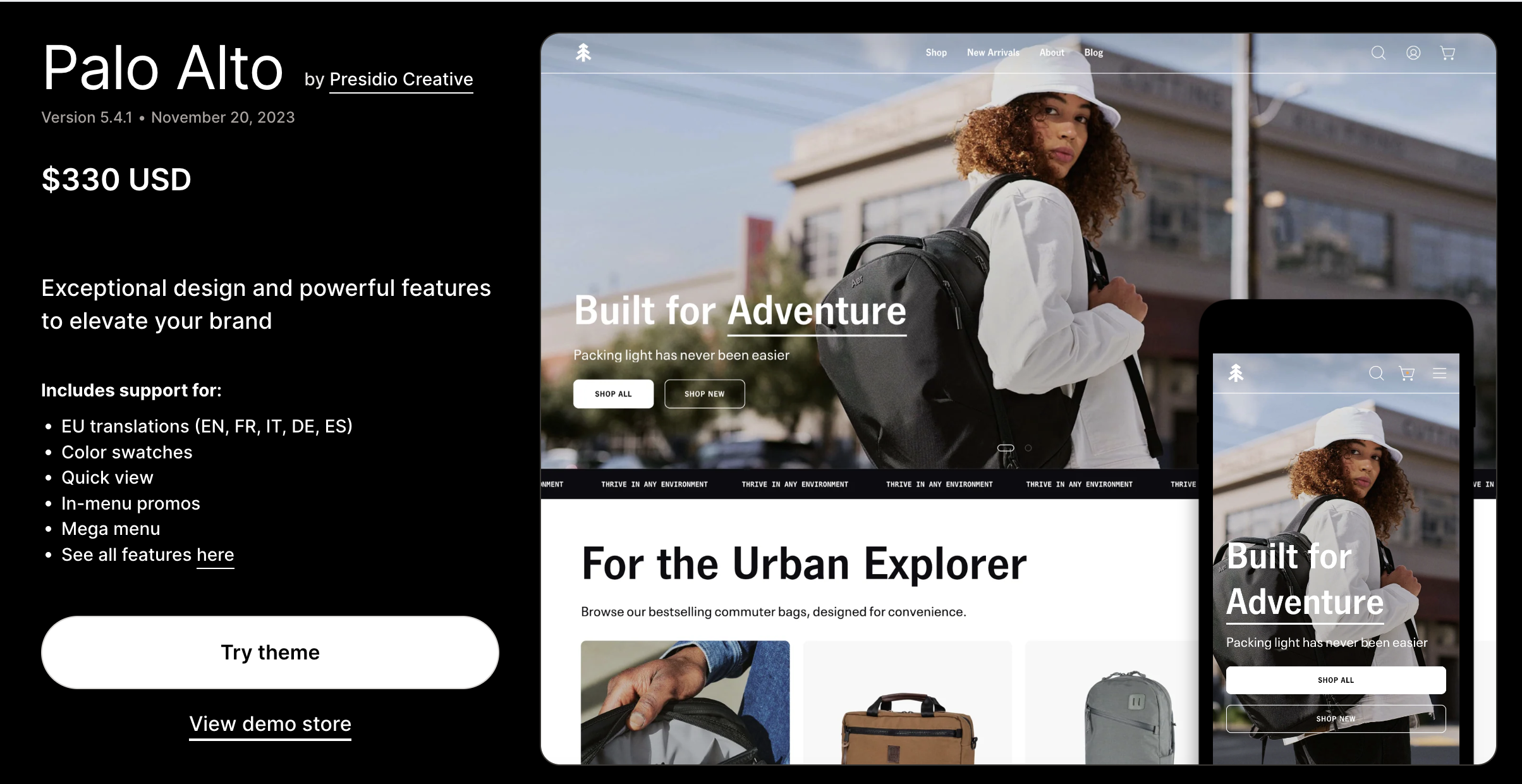 - Purchase or Add Theme: If Palo Alto fits your needs, you can purchase or add the theme to your Shopify account directly from the Theme Store.