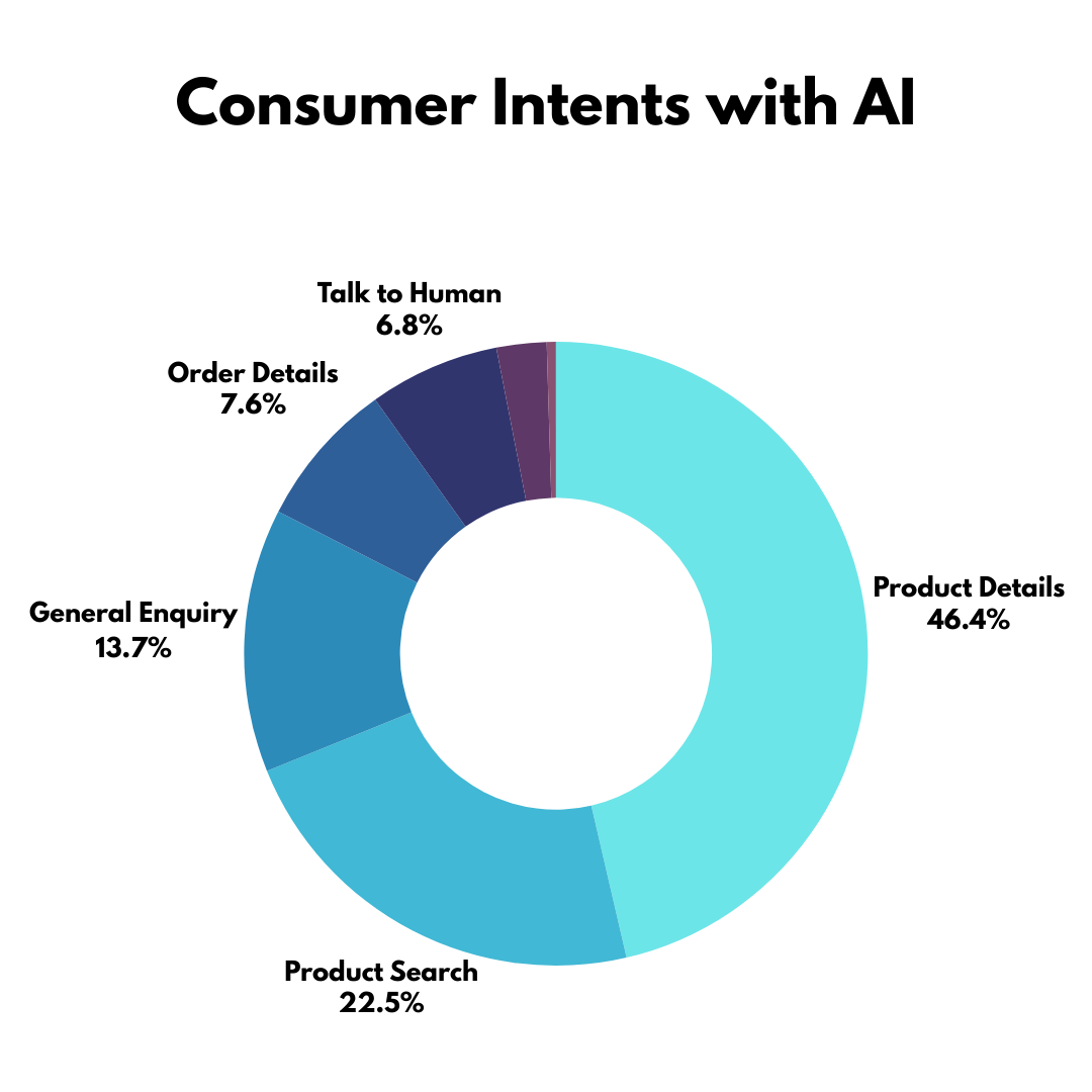 Only 6% of total consumers seek to still speak with a human. Rest of the consumers are extremely happy with what AI has to answer. 46% of the queries are around Product details like "Will this be suitable to my dry skin?" or "will size L fit me in?"
