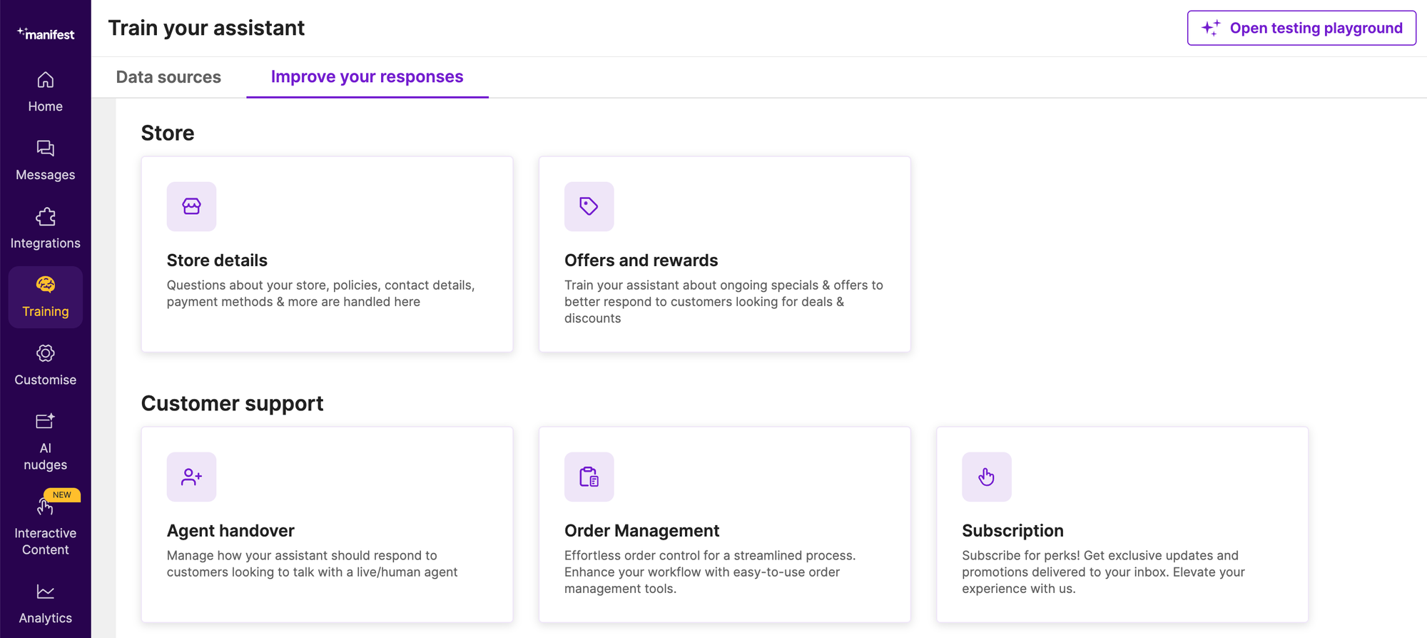 The assistant was trained on comprehensive product information, including descriptions, specifications, and ongoing offers. Additionally, Manifest leveraged its default training capabilities on existing website content like policies and FAQs. To further personalize the experience, Riley Watson added details about current promotions and customer preferences.