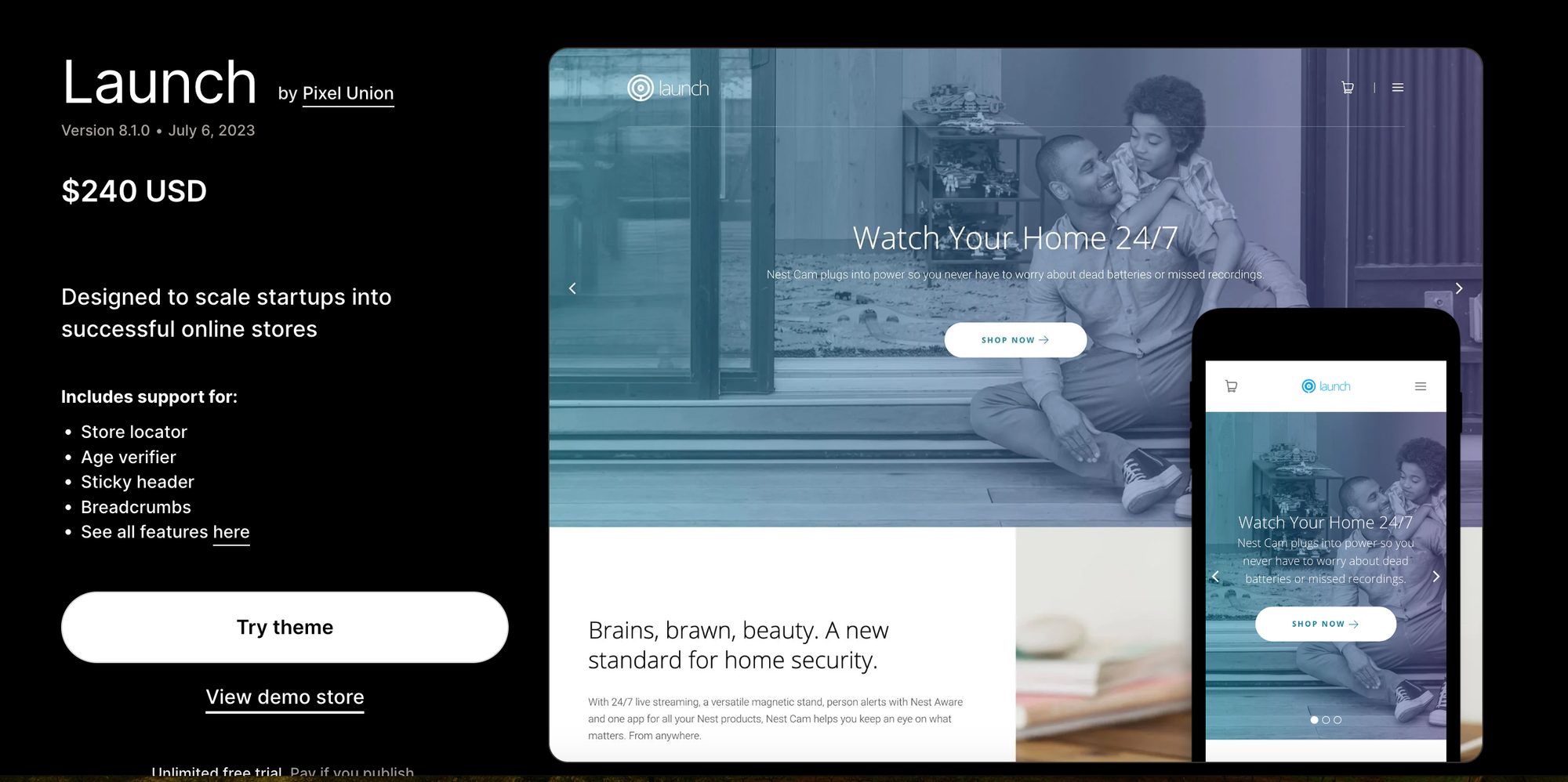 Shopify launch theme is a theme designed specifically for single products or small catalogs. It features a clean, bold layout focused on showcasing products impressively and clearly.