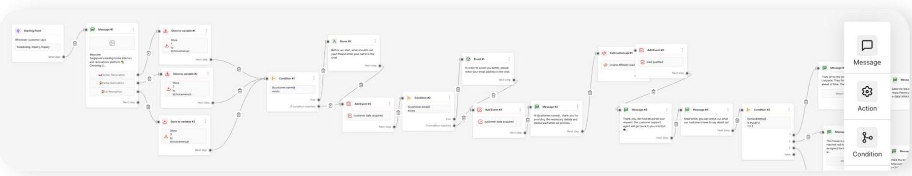- For new leads, we introduced our value proposition (video/audio testimonials) and took requirements (room, room size, layout, email, pin code, budget).