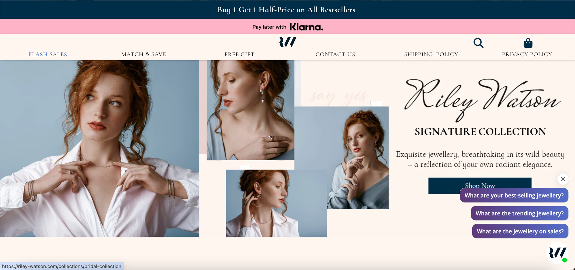 One of the most successful retail Shopify stores, Riley Watson Jewellery is designed with clear, helpful information right on the homepage. Navigation is streamlined into well-defined sections like “Rings,” “Necklaces,” and “Bracelets,” making it easy for users to find what they need. The website layout ensures that once customers arrive, they have little reason to leave, thanks to its engaging and user-friendly design.