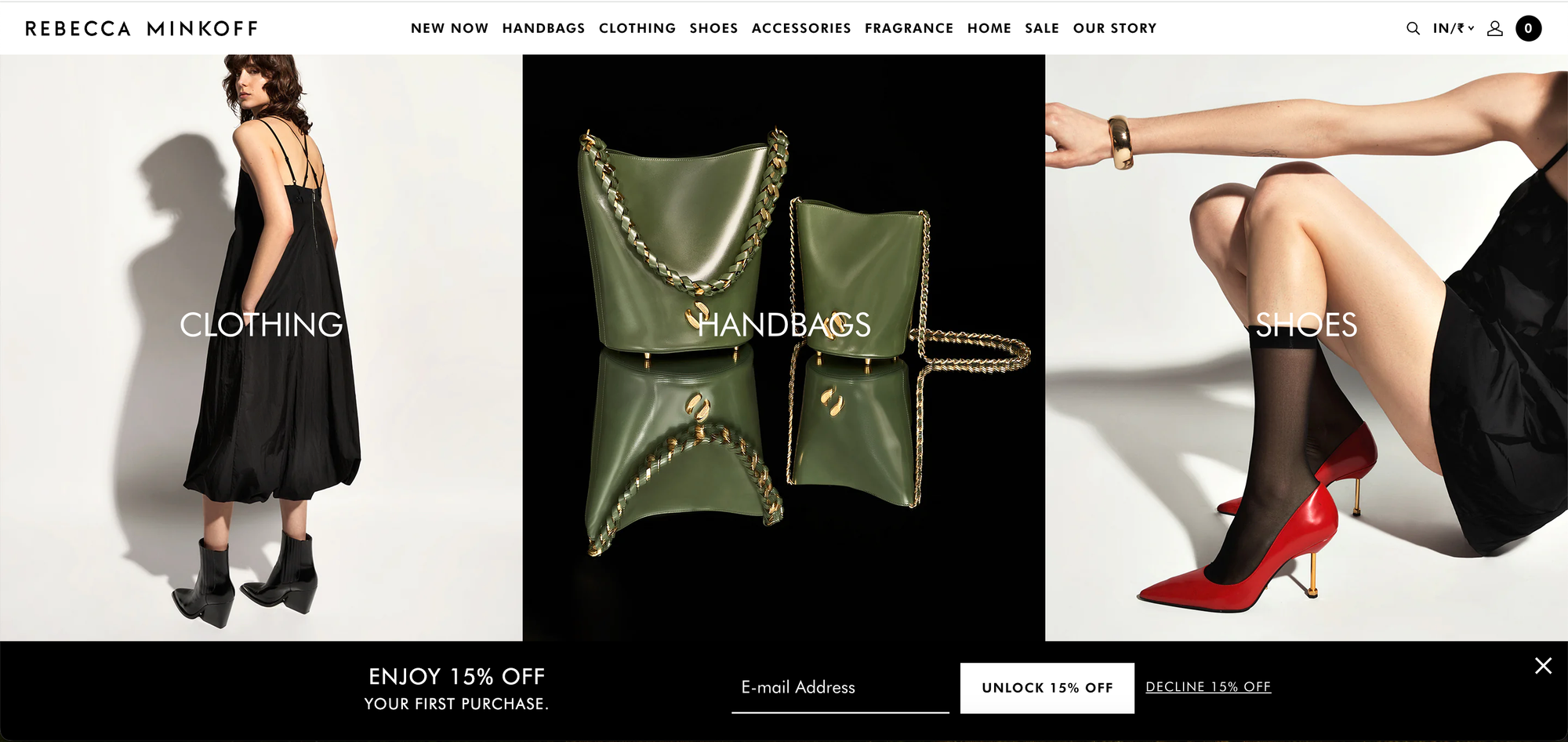 Step into a world of luxury with Rebecca Minkoff's captivating Shopify store (US, $75M-$100M revenue). Here, product images reign supreme – crisp, magazine-quality photographs that showcase each piece with stunning detail. It's more than just browsing products; it's an immersive experience, transporting you to a chic boutique.