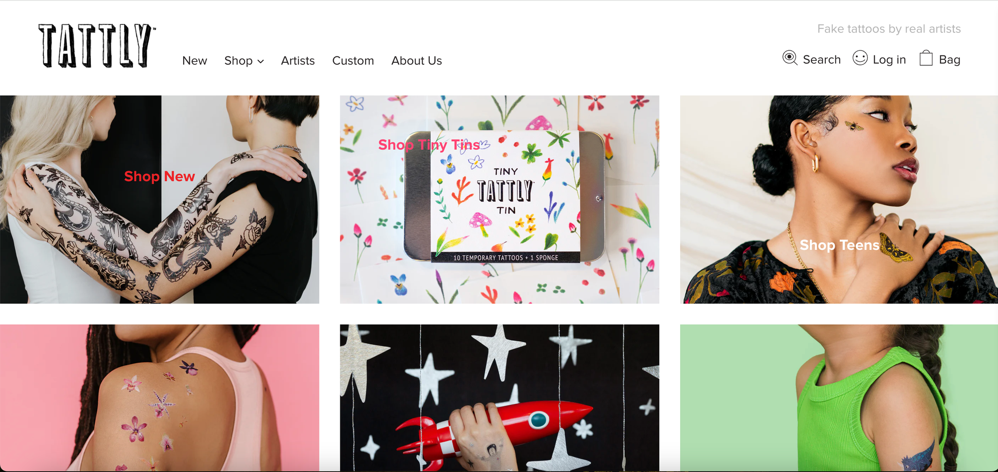 Tattly, a Brooklyn-based gem (revenue: $5M-$10M), knows the art of luring you into a delightful browsing adventure on their Shopify store. Unlike many websites that spoon-feed you information, Tattly lets their products do the talking. An image-based menu replaces text categories, enticing you to visually explore their temporary tattoo collections.